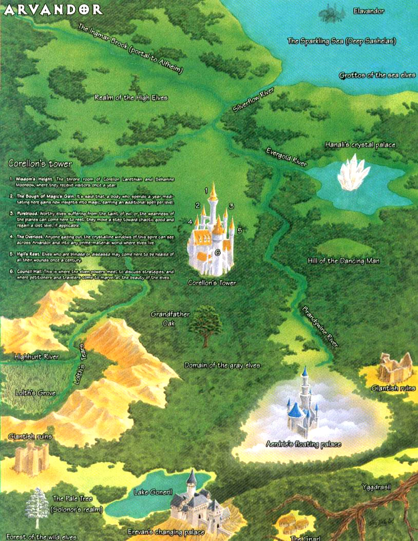 Arvandor, dom Seldarine jest oddzielony od Olimpu przestrzenią dziczy. Oba te miejsca uznawane są za najwyższe punkty na planie, żadne jednak nie leży wyżej od drugiego.