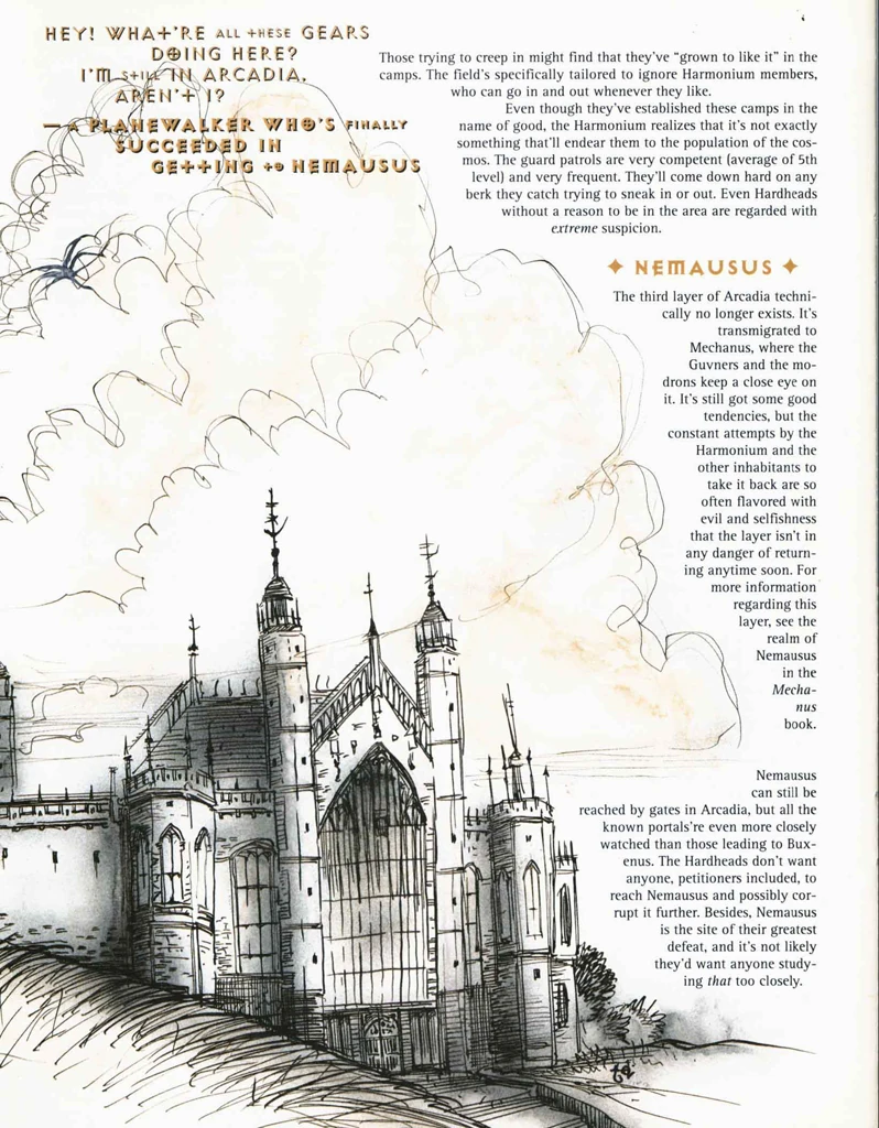 Trzecia warstwa Arkadii, Nemausus, technicznie już nie istnieje. Przeniosła się do Mechanusa, gdzie jest bacznie obserwowana przez Guwernantów i modrony. Choć wciąż zachowuje pewne cechy dobra, nieustanne wysiłki Harmonium i innych mieszkańców, mające na celu jej odzyskanie, są często przesiąknięte złem i egoizmem, co oddala perspektywę powrotu warstwy.