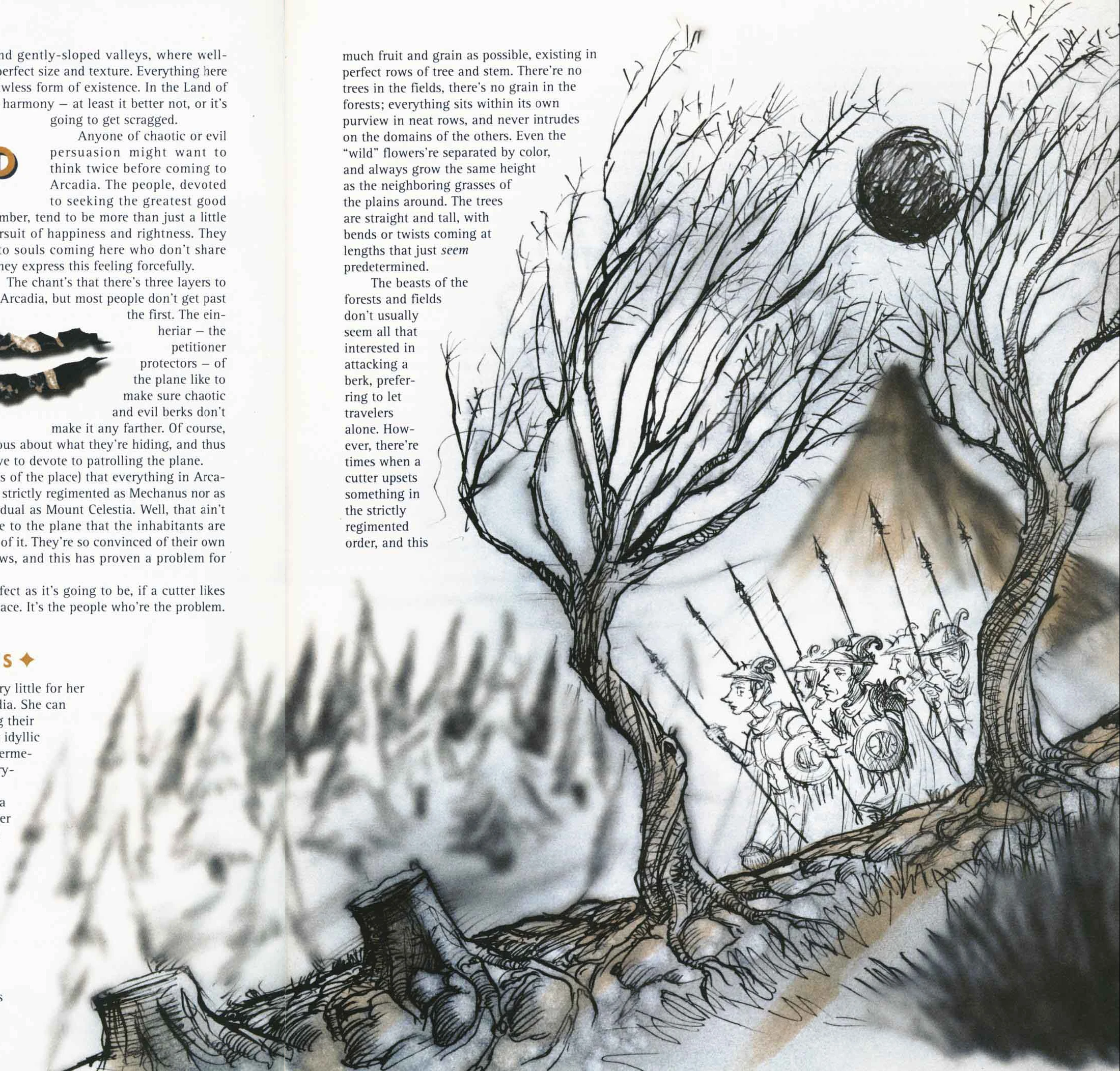 Osoby o charakterach innych niż praworządny dobry i praworządny neutralny powinny zachować ostrożność podczas pobytu w Arkadii. Od chaotycznych dobrych oczekuje się szybkiego załatwienia spraw i opuszczenia krainy, neutralni są odprowadzani do najbliższego portalu, a osoby o złym charakterze są atakowane bez ostrzeżenia. Jedynym sposobem na uniknięcie takiego losu jest magiczne ukrycie swojego charakteru.
