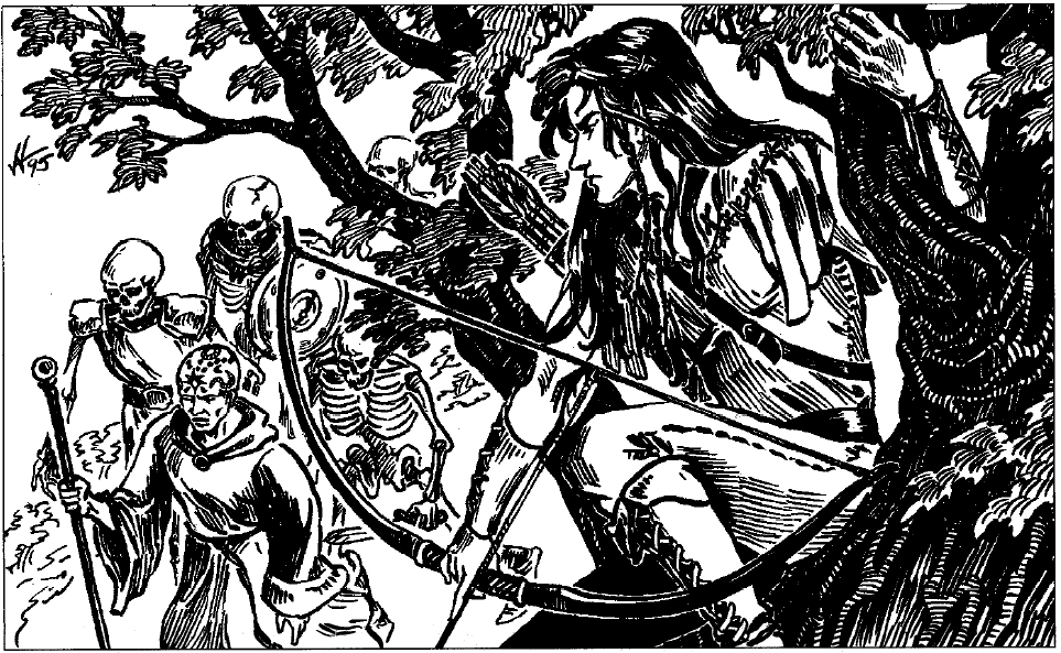 Półelf z Aglarondu obserwujący oddział Thay prowadzony przez Czerwonego Czarnoksiężnika