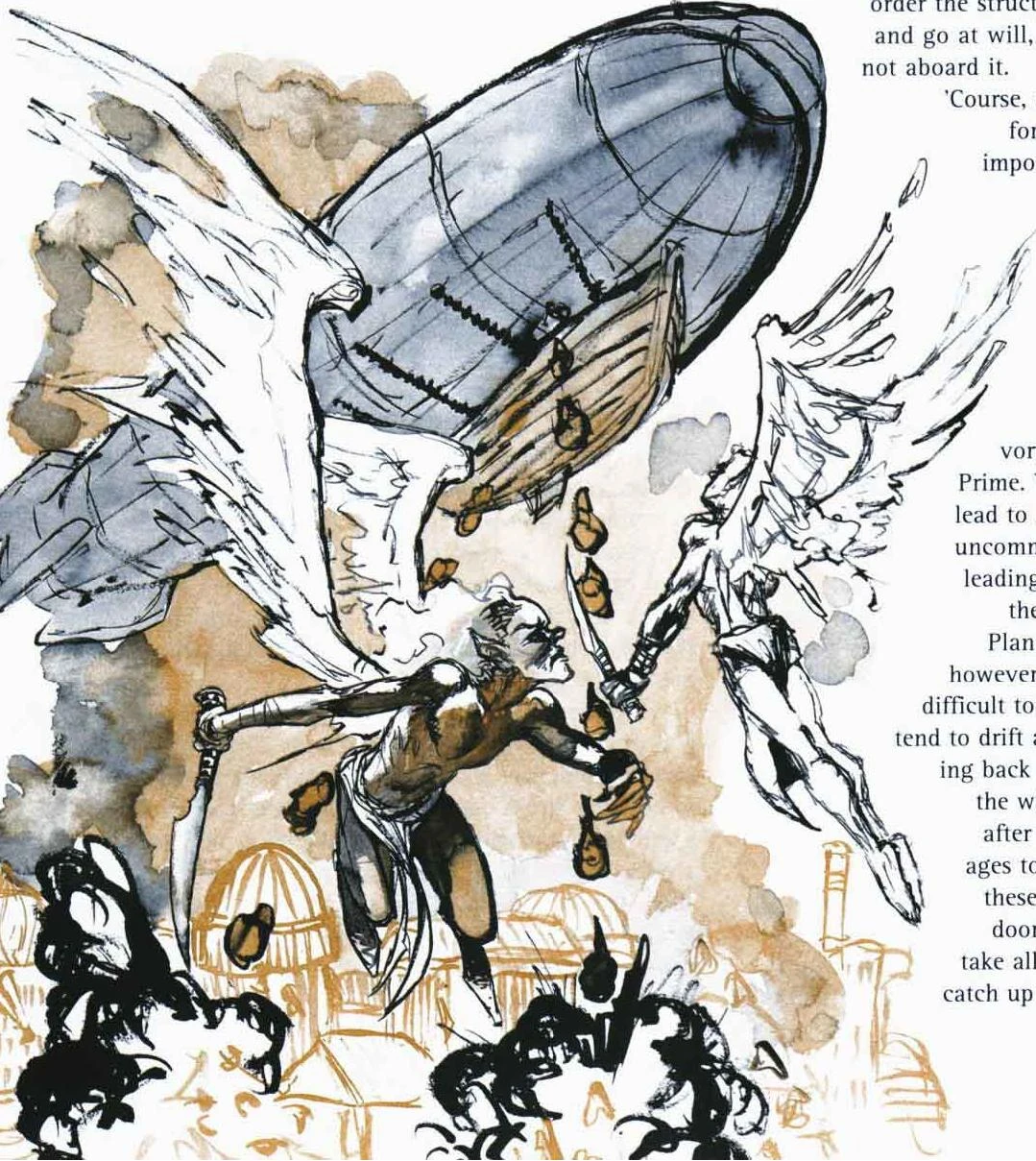 Uskrzydlone istoty zamieszkujące plan Powietrza ze sterowcem w tle
