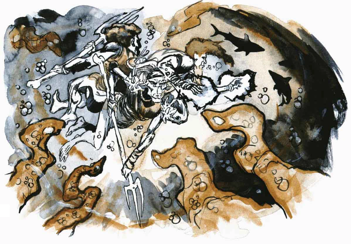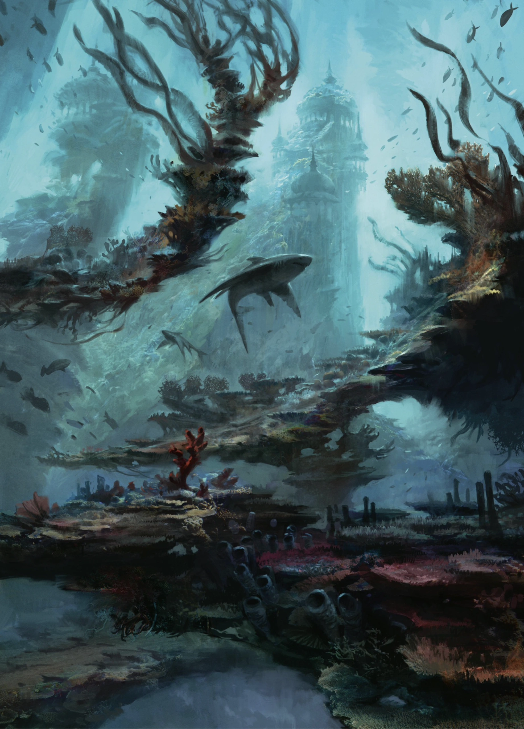 Plan ten, pozornie spokojny i bezpieczny, bywa jednak zdradliwy. Można tu zostać wciągniętym w prąd bulgoczącego strumienia wody, wessanym przez wir, porażonym przez kieszeń elektryczności, schwytanym przez trytony albo zaatakowanym przez wodne dziwy.