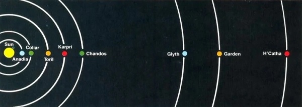 | Planety | Anadia | Coliar | Toril | Karpri | Chandos | Glyth | Ogród | H'Catha |