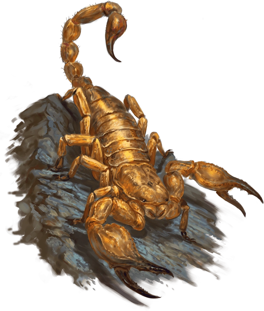 Skorpiony to charakterystyczna grupa pajęczaków, na pierwszy rzut oka rozpoznawalna po dużych szczypcach i żądle jadowym umiejscowionym na końcu ogona. Mimo niepokoju, jaki wzburzają, większość skorpionów ma niewielkie rozmiary i jest niegroźna dla humanoidów. Inaczej ma się sprawa w przypadku ogromnych skorpionów, które osiągają długość nawet do dwóch metrów i polują na istoty o zbliżonej wielkości. Najczęściej spotykane są w ciepłych i suchych okolicach, istnieją jednak gatunki preferujące chłodniejsze okolice, a także podziemia. Ogromne skorpiony mają tułów pokryty zielonym pancerzem, a ich szczypce i odnóża mają kolor żółto-zielony. Segmentowany ogon z zakrzywionym żądłem położonym na jego końcu jest czarny. Ciało istoty wydziela gorzkawy zapach, prawdopodobnie pochodzący od jadu. Przy poruszaniu się, ogromne skorpiony wytwarzają niepokojący szelest.
