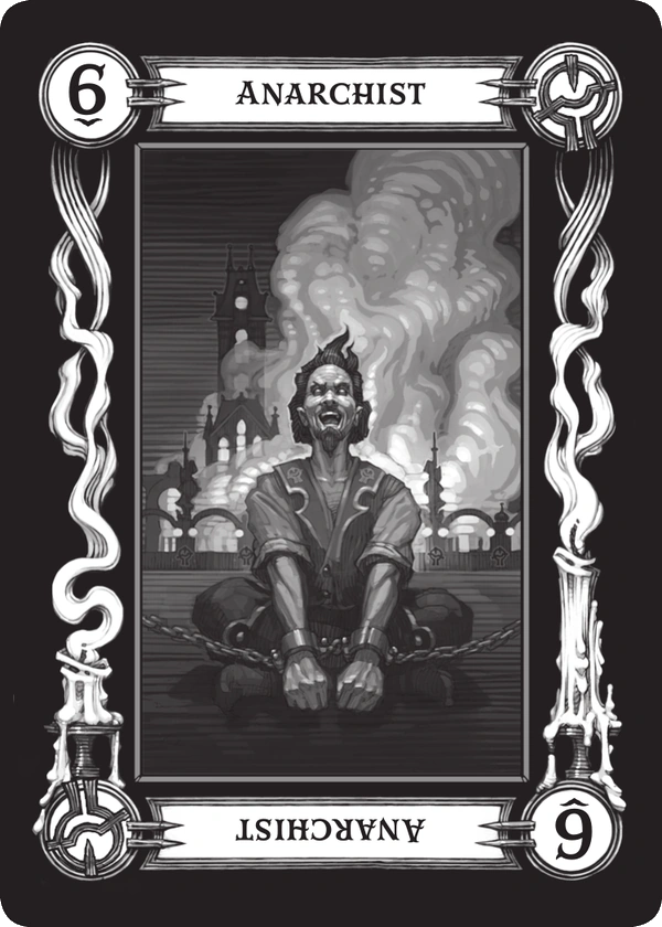 - Szóstka (Anarchista) (ang. Six (Anarchist)) - Ta karta odzwierciedla fakt, iż prawdziwa statyka jest sztucznym umysłem ludzkiego umysłu. Natura domaga się, by wszystkie rzeczy pozostały w nieustannej zmianie oraz że wszystko jest ubywające i przemijające na dłuższą metę. Kiedy postrzegana za dobrą, oczywiście oznacza polepszenie i korzyści w pewnym aspekcie czyjegoś życia lub ogólny stan ludzkości. Kiedy wzięta negatywnie, odnosi się do umysłowej entropii, rozkładu i załamania. Karta ta jest przyjacielem tych, którzy pragną polepszyć siebie lub obalić przeciwnika, lecz sprzeciwia się wszystkim, którzy lubią sprawy "takimi jakie po prostu są", gdyż nic nie pozostaje takie na długo. Ilustracja na karcie mężczyznę zakutego w kajdany.