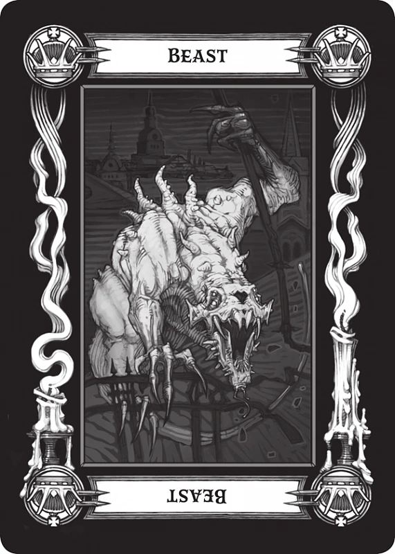 - Bestia (ang. The Beast) - Ta karta wzywa do przypomnienia dzikości, która czai się w nawet najbardziej cywilizowanej osobie. Nie oznacza to, iż ta zwierzęca natura wyjdzie na wierzch. a jedynie to iż jej wpływ będzie odczuwalne. Jednakże często zwiastuje zbrodnie wykonane z pasji czy innych pochopnych czynów. Uważana jest także za kartę patronującą wszystkim likantropom czy innym zmiennokształtnym. Ilustracja tej karty obrazuje niezidentyfikowane stworzenie.