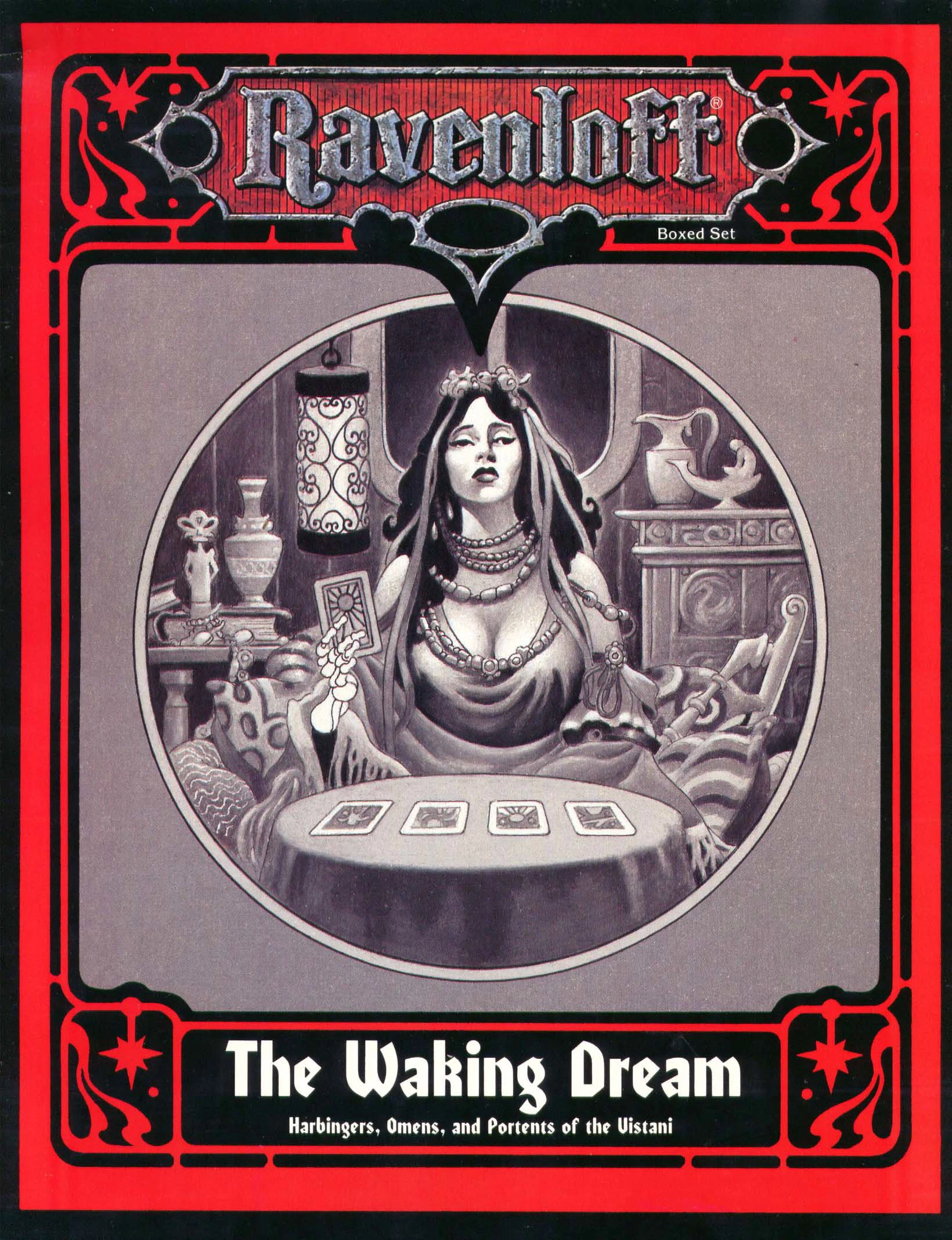 Vistana rozkładająca karty tarokka, okładka The Waking Dream, księgi Forbidden Lore