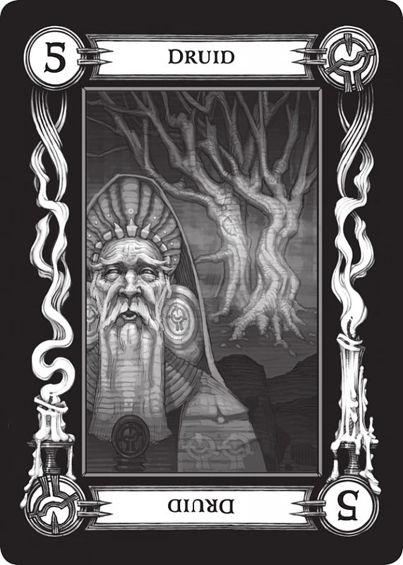 - Piątka (Druid) (ang.Five (Druid)) - Jak można się spodziewać, ta karta odzwierciedla wartości natury i wrodzoną boskość królestwa zwierząt. Nie mając żadnych uprzedzeń wobec dobra czy zła, zwierzęta działają zgodnie ze swoimi emocjami, obawami i pragnieniami. Jako oznaka dobra, często wskazuje to na duchowe zdrowie, wolność od umysłowej dominacji i wyzwolenie z kontrolujących obowiązków czy emocji. Kiedy brana za zło, ma tendencję wskazywać na wewnętrzny zgiełk, który porusza naturalny spokój umysłu. W niektórych przypadkach zwiastuje umysłową chorobę lub podobne zaburzenie. Często jest odbierana jako odzwierciedlenie mądrości osoby, z negatywnym aspektem wskazującym na głupie decyzje w rozrachunku. Ilustracja ukazuje starego druida stojącego na tle dwóch drzew.
