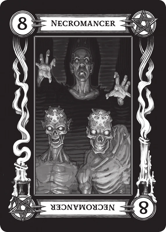 - Ósemka (Nekromanta) (ang. Master (The Necromancer) - Ta karta mówi o potężnym i uczonym człowieku, który zwrócił swój przenikliwy umysł dążeniu do zła. Jego wielkie talenty, które mogłyby zajść daleko w służbie ludzkości, zostały skierowane do wewnątrz by służyć tylko jego własnemu pragnieniu potęgi i wiedzy. Ilustracja na tej karcie ukazuje mrocznego czarodzieja przed którym stoją dwa dziwaczne, nagie nieumarłe ciała z gwiazdami na czołach. Ta karta jest, jak można się domyśleć, powiązana ze wszelkim rodzajem nieumarłych istot. Podczas gdy wielu amatorów przyjmuje, iż karta ta oznacza śmierć w przyszłości, rzadko ma to miejsce. O wiele częściej karta ta ostrzega o pragnieniu władzy lub nienaturalnej fascynacji czy obsesji. Wskazuje na chciwość wiedzy i władzy, lecz nie zawsze bogactwa. Ponieważ ci, którzy władają nieumarłymi często kończą sami nosząc taką klątwę, przyjmuje się także, iż ktoś może rozdziać ziarna własnej zagłady oraz iż jego władca moc może się zwrócić przeciwko niemu lub stać się powodem jego niepowodzenia.