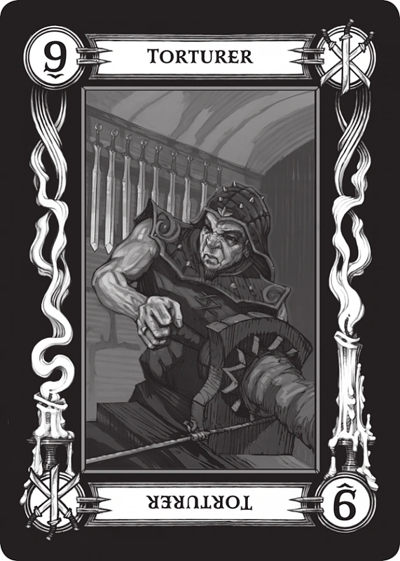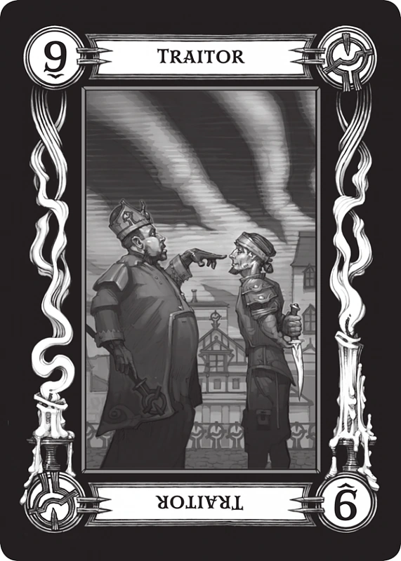 - Dziewiątka (Zdrajca) (ang. Nine (Traitor)) - Pośród budzących największy strach wielu kart tarokka, ta jedna oznacza zdradę kogoś bliskiego i zaufanego. Może ostrzec o wojowniku, który zwróci się przeciw tym, których przysiągł bronić, o lekarzu który odrzuci lekarski kod, którym żyje, niewierny małżonek bądź renegat zapewniający informacje wrogom swojego własnego ludu. Każdy kto obróci się plecami do tych, którzy na nim polegali zostaje oznaczony przez tę kartę. Kiedy ustawiona w nieco bardziej pozytywnym świetle, karta ta może oznaczać iż istnieje słaba więź śród ludzi zatrudnionych przez wroga. Prawdopodobnie minister służący tyranowi może zostać przekonany do dołączenia sił tych, którzy chcieliby tyrana obalić. Rysunek przedstawia samotną postać odzianą w czarny płaszcz, oznaczoną dziewięcioma glifami. Jest przyjacielem czy wrogiem, dobry czy zły? Nie mamy jak się tego dowiedzieć, lecz jego obszerna szata i donosicielska postura sugerują iż nie oznacza on nic dobrego.