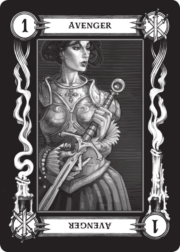 - Jedynka (Mściciel) (ang. One (The Avenger)) - Ta karta ma koligację ze wszystkimi o chaotycznym dobrym charakterze. Ilustracja ukazuje kobietę w szlacheckiej zbroi, trzymającą mistrzowsko wykonany długi miecz. Karta ta jest symbolem ostatecznej sprawiedliwości i zemsty za wielkie krzywdy. Jest to symbol tych, którzy są w trakcie wielkich misji wytępienia ze świata starożytnego zła. Jest to także karta błędnego rycerza, szlachetnego wojownika lojalnego wobec żadnego pana.