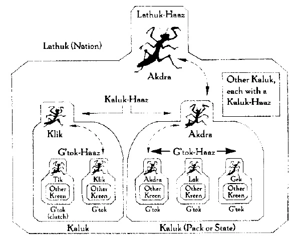 Tohr-krińskie określenie na "sforę" to kaluk, a na "przywódcę" to haaz. Kaluk ma powiązanie bardziej z "państwem" niż "plemieniem", jak wskazuje tek czy kek. Podobnie haaz jest bliższe "zarządcy" w znaczeniu, w przeciwieństwie do hoz, które bardziej oznacza "wodza". Takoż pośród tohr-krinów przywódca sfory jest poprawniej zwany kaluk-haaz i ma podobny status do regionalnego zarządcy humanoidów.